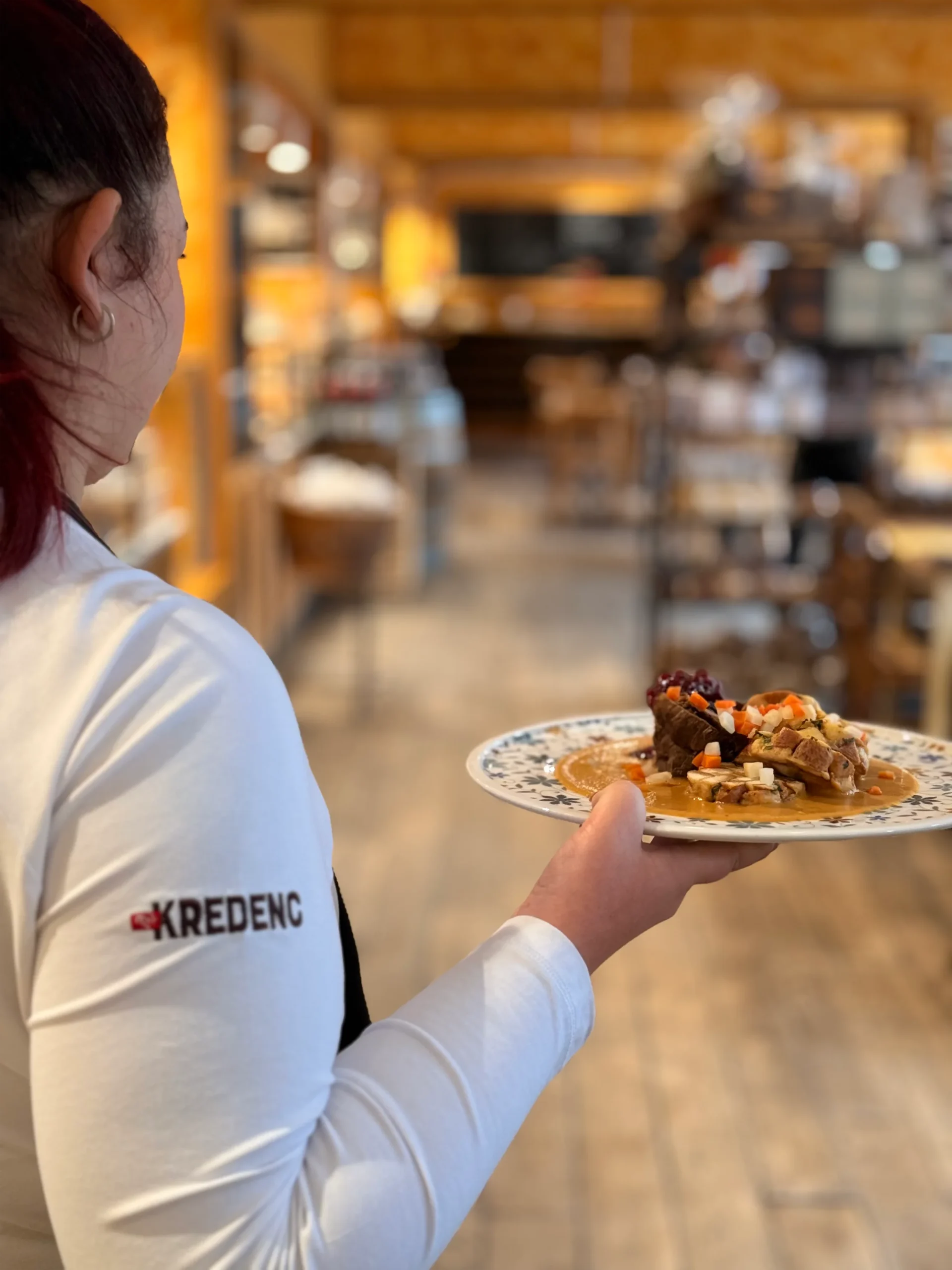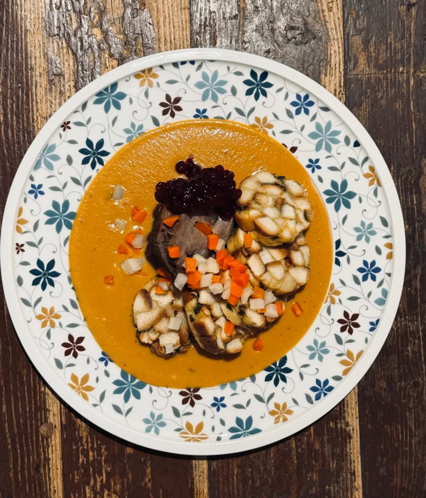 • Hovězí pečeně na smetaně, žemlový knedlík, brusinky, kořenová zelenina