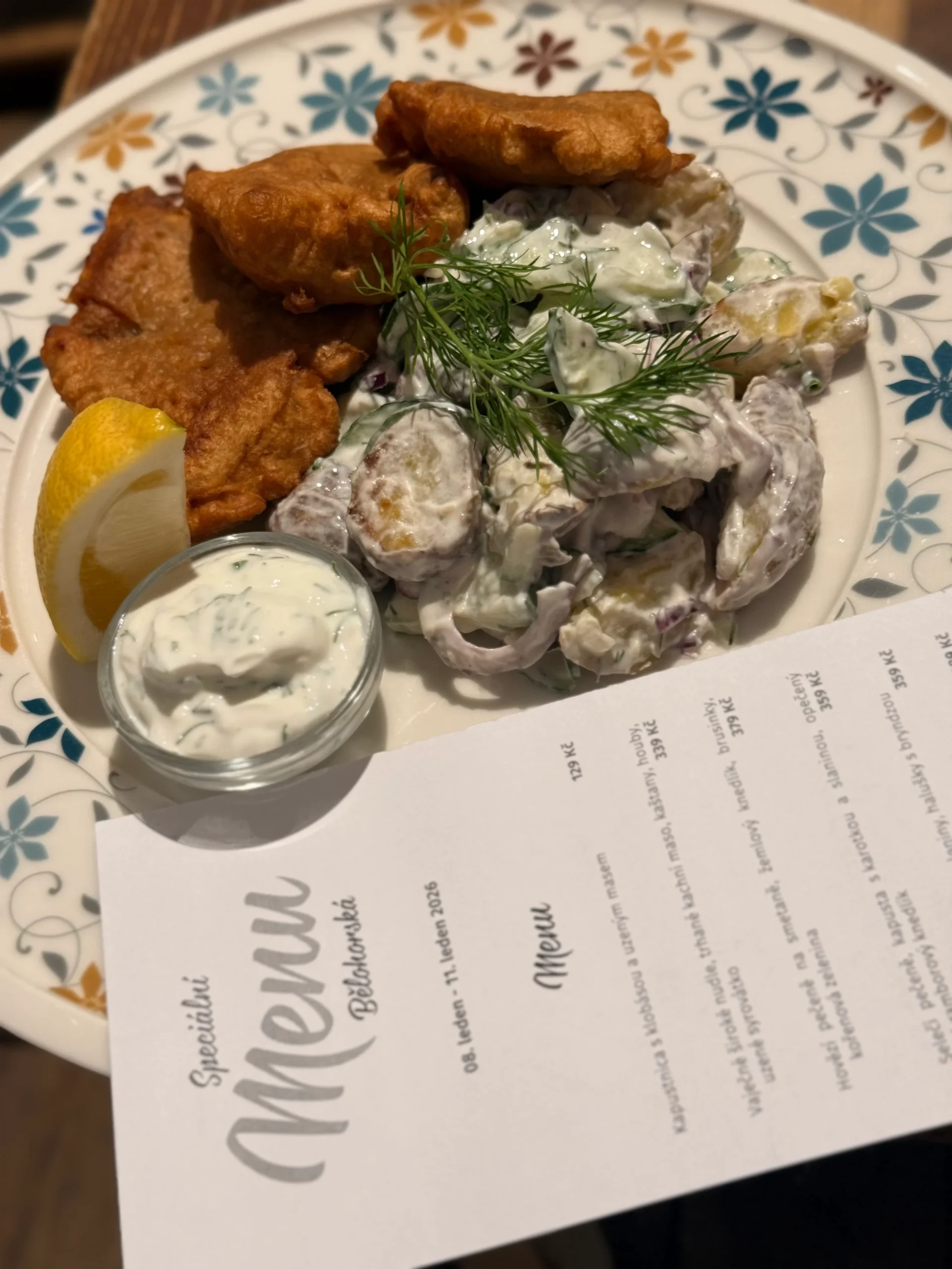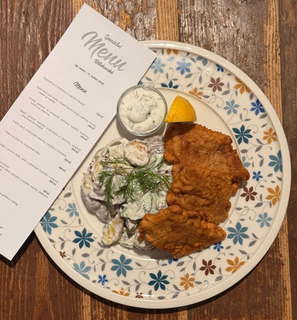 • Candát v pivním těstě, salát z pečených brambor s koprem