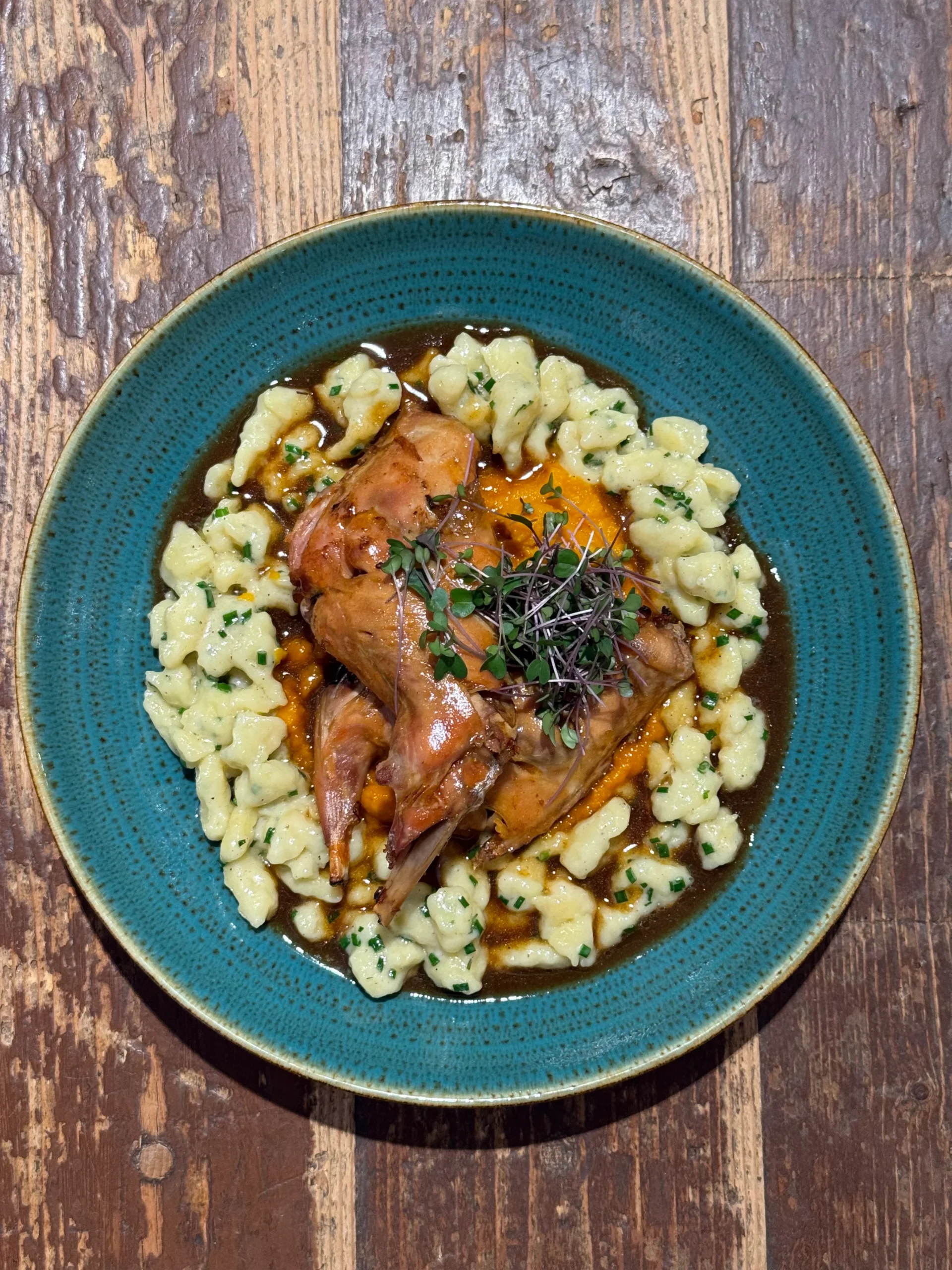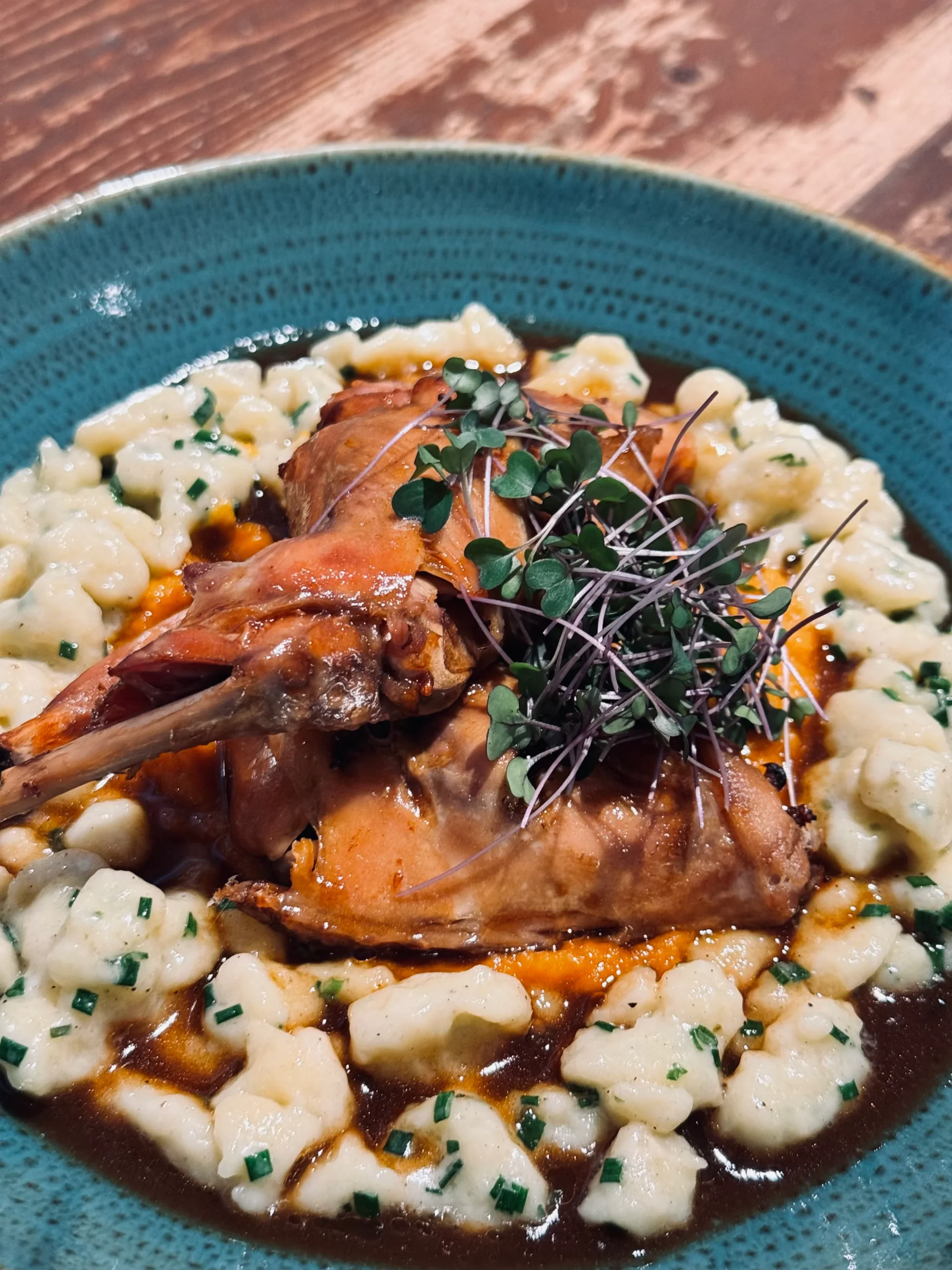 • Králík, pyré z kořenové zeleniny, halušky s bryndzou